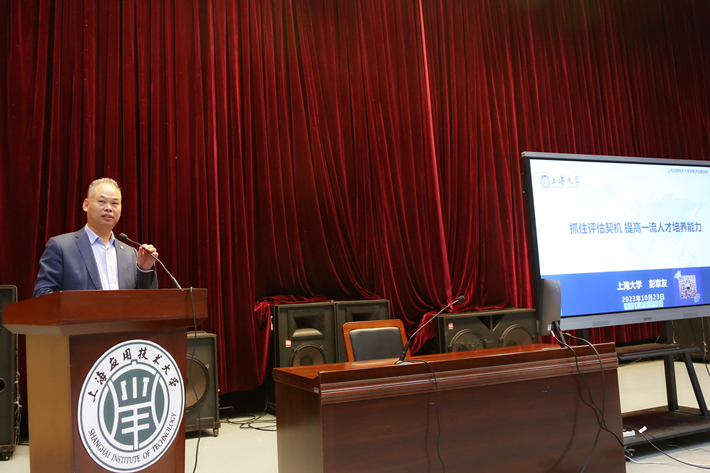 上海大学教务部部长彭章友教授应邀作专题辅导报告,他从“加快教育教学改革”“提升质量保障能力”“做实迎评准备工作”三个方面,全面细致地介绍了上海大学新一轮审核评估工作方案和实施情况,并结合校内自评关键环节,介绍了学校自评自建过程中的特色做法与经典案例,呈现了上海大学质量文化建设效果,并与学校相关职能部门和二级学院就如何开展自评自建工作进行了互动交流。