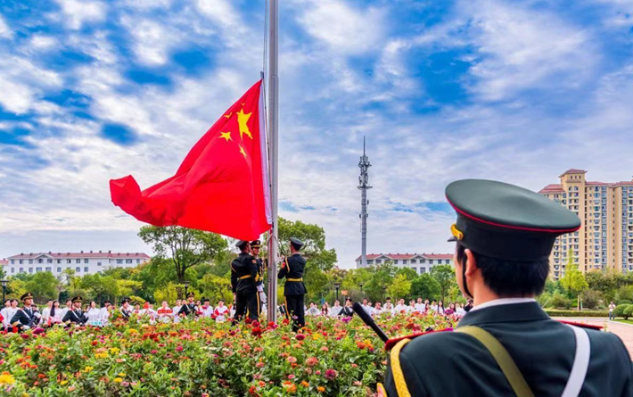 郭庆松在奉贤校区升旗仪式现场发表热情洋溢的讲话,带领师生深情回顾74年来中国共产党团结带领全国各族人民艰苦奋斗取得的巨大成就。他表示,学校伴随着新中国应运而生,始终与祖国同步伐、与人民共命运,经过一代代上应人的挺膺担当、接续奋斗,学校发展驶入快车道、迈上新台阶。明年学校将迎来70周年校庆,全校师生将共同见证学校70载的光荣与辉煌。