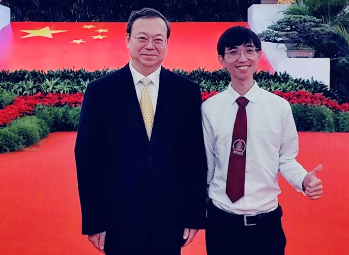 我校轨道交通学院老挝留学生代表李东受邀参加招待会,上海市人大常委会副主任、市友协会长陈靖对李东予以勉励并合影留念。