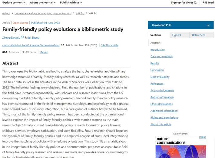 近日,上海应用技术大学人文学院李正东教授研究团队的最新研究成果在国际著名学术期刊Nature旗下人文社科子刊“人文社会科学通讯(Humanities and Social Science Communicatios)”正式发表,论文题目为Family-friendly policy evolution: a bibliometric study。