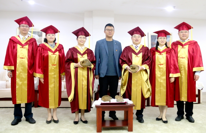 5月28日,应邀回校参加2023届学生毕业典礼的我校2017届校友、西藏自治区日喀则市定日县文旅局副局长高阳平向母校捐赠纪念品——珠峰海螺化石,在毕业典礼前全体校领导集体接见了校友高阳平。