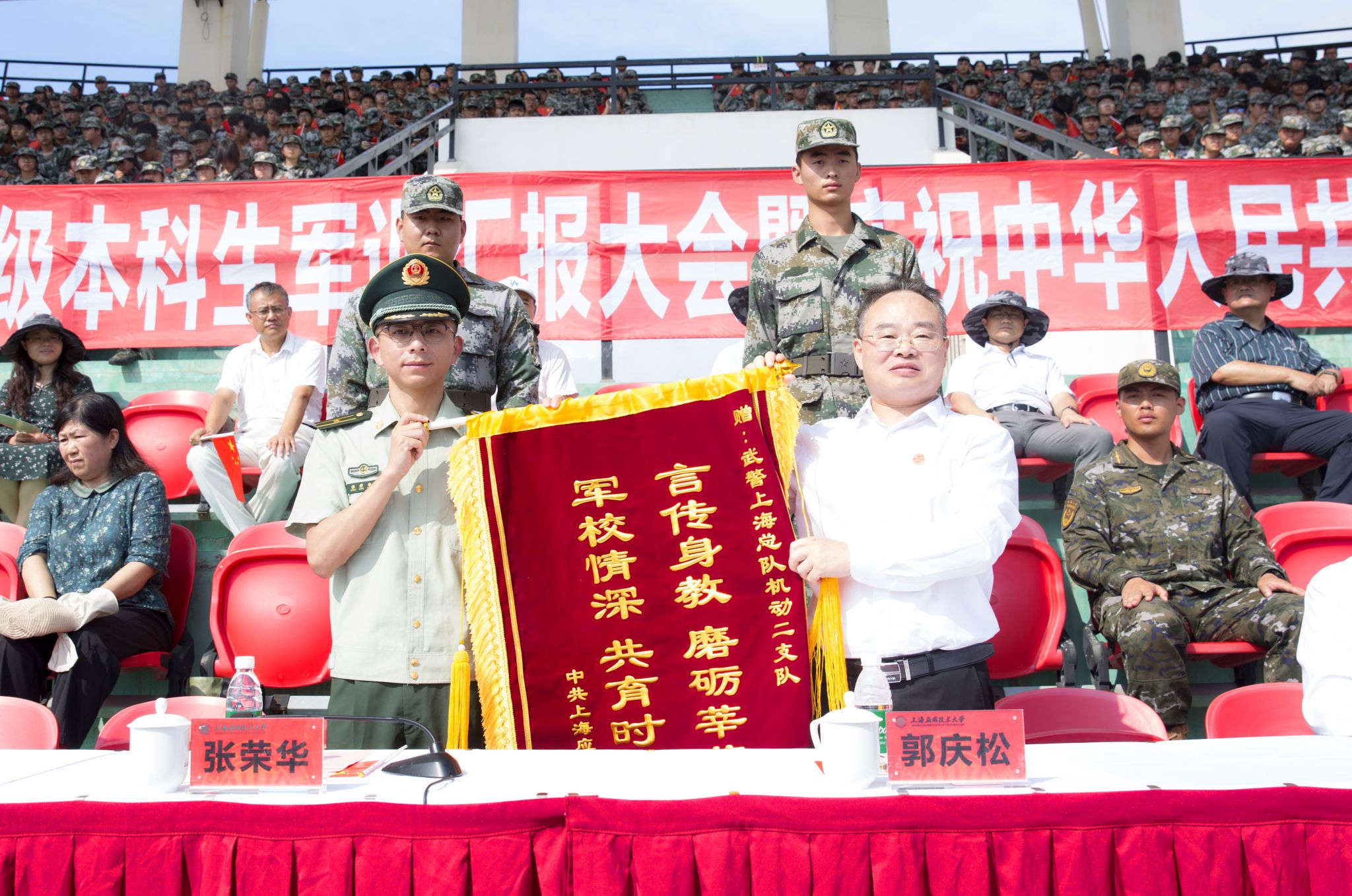 郭庆松代表学校向承训部队赠送锦旗,对部队对我校国防教育工作和学生军训工作的大力支持与帮助表示衷心感谢。