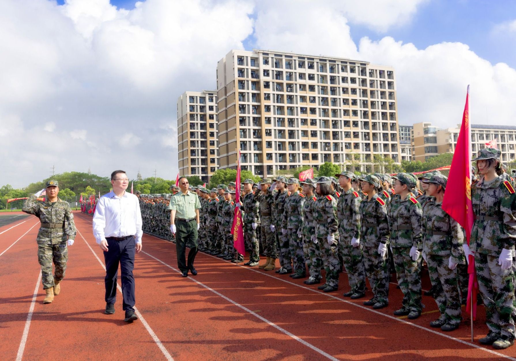 阅兵仪式上,汪小帆检阅各方阵队列。党委学工部部长、人民武装部部长、军训旅政委袁翔,武警上海总队某支队领导、军训旅常务副旅长赵教官陪同检阅。