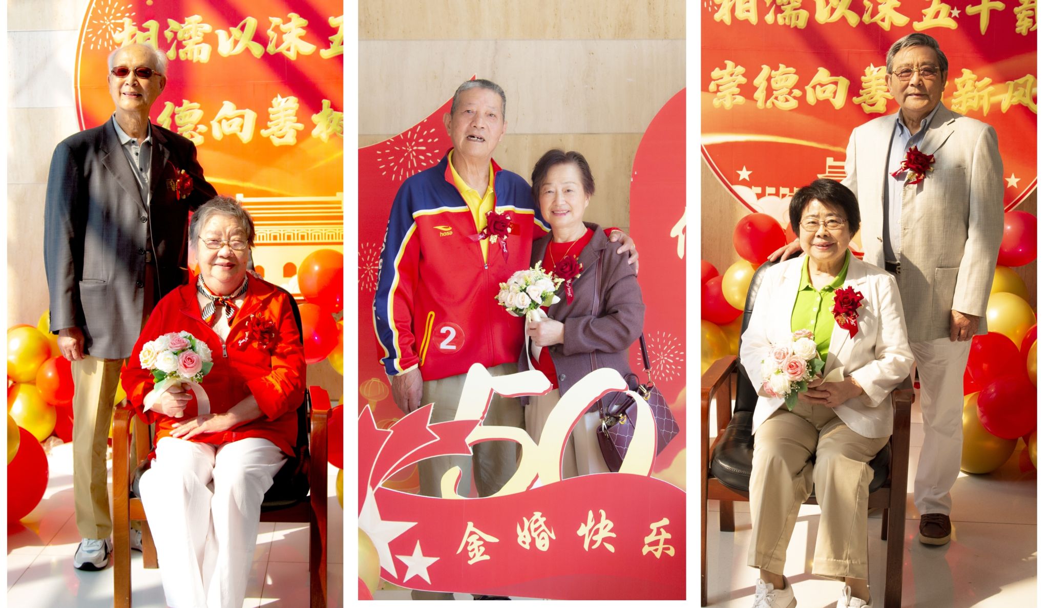 岁月悠悠,相濡以沫,真情弥新。我校已满50年婚龄的共有243对佳侣。30余对金婚佳侣来到金婚庆典现场。他们脸上洋溢着幸福的笑容,共同见证从青丝到白发的浪漫携手。