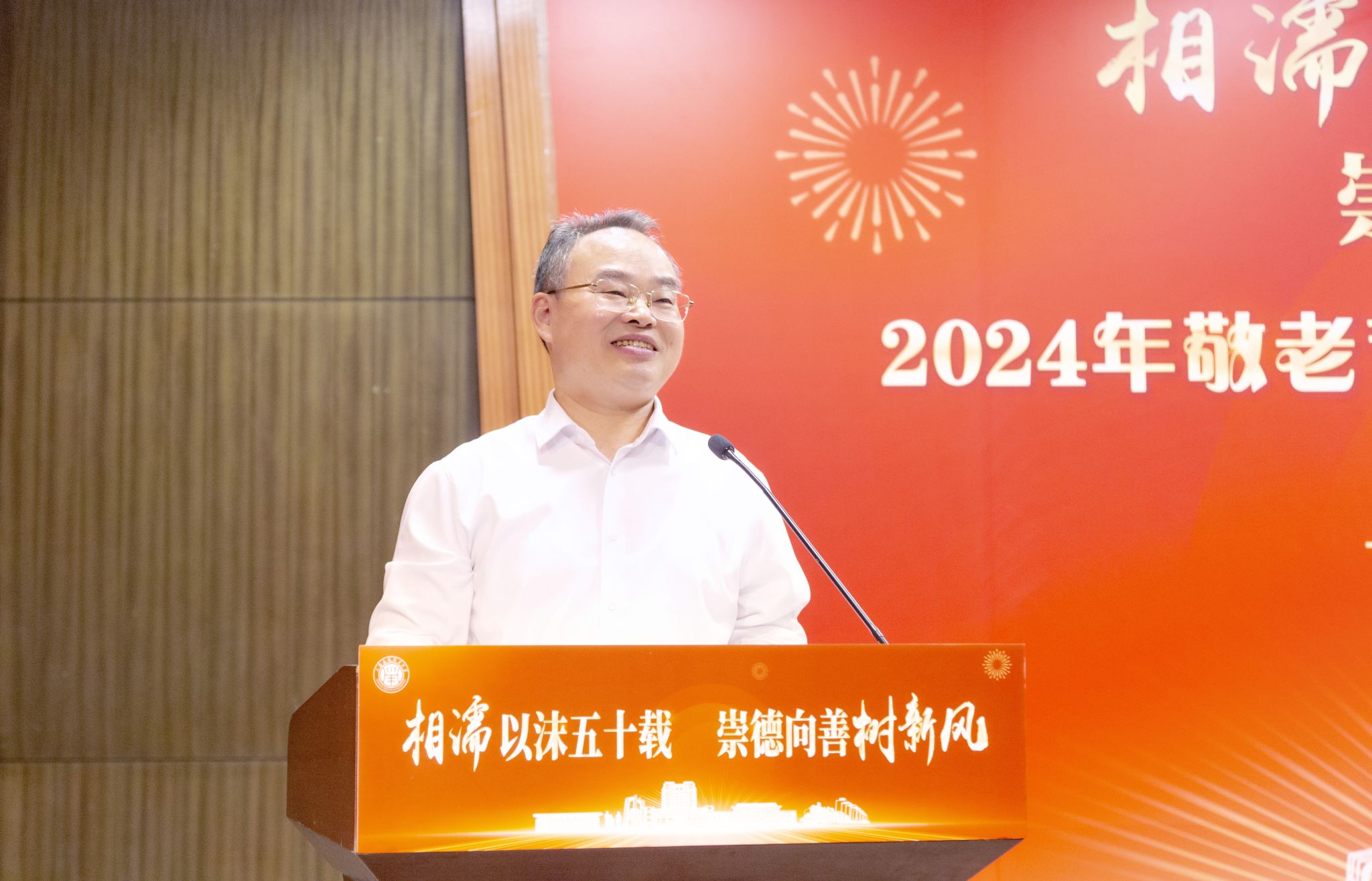 陈海瑾在致辞中祝福金婚佳侣恩爱永恒,生活幸福美满,期待老同志们继续做引领学校发展的智囊、做教育引导下一代的表率、做维护学校稳定的桥梁,学校会一如既往关心关爱老同志,用心用情做好服务保障。