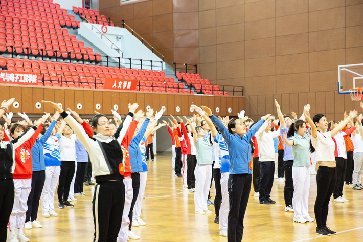 教工广播体操比赛是本届健康文化节的启动活动,19支队伍带着响亮的口号,统一着装、精神抖擞、神采飞扬地展现在评委面前。音乐响起,参赛队员们队列整齐、动作整齐划一,舒展流畅地做出伸展、扩胸、转体、踢腿、跳跃等一系列动作,用阳光自信的姿态、整齐规范的动作展示出上应人昂扬向上的精神风貌、传递着上应人健康奋进的生活方式。