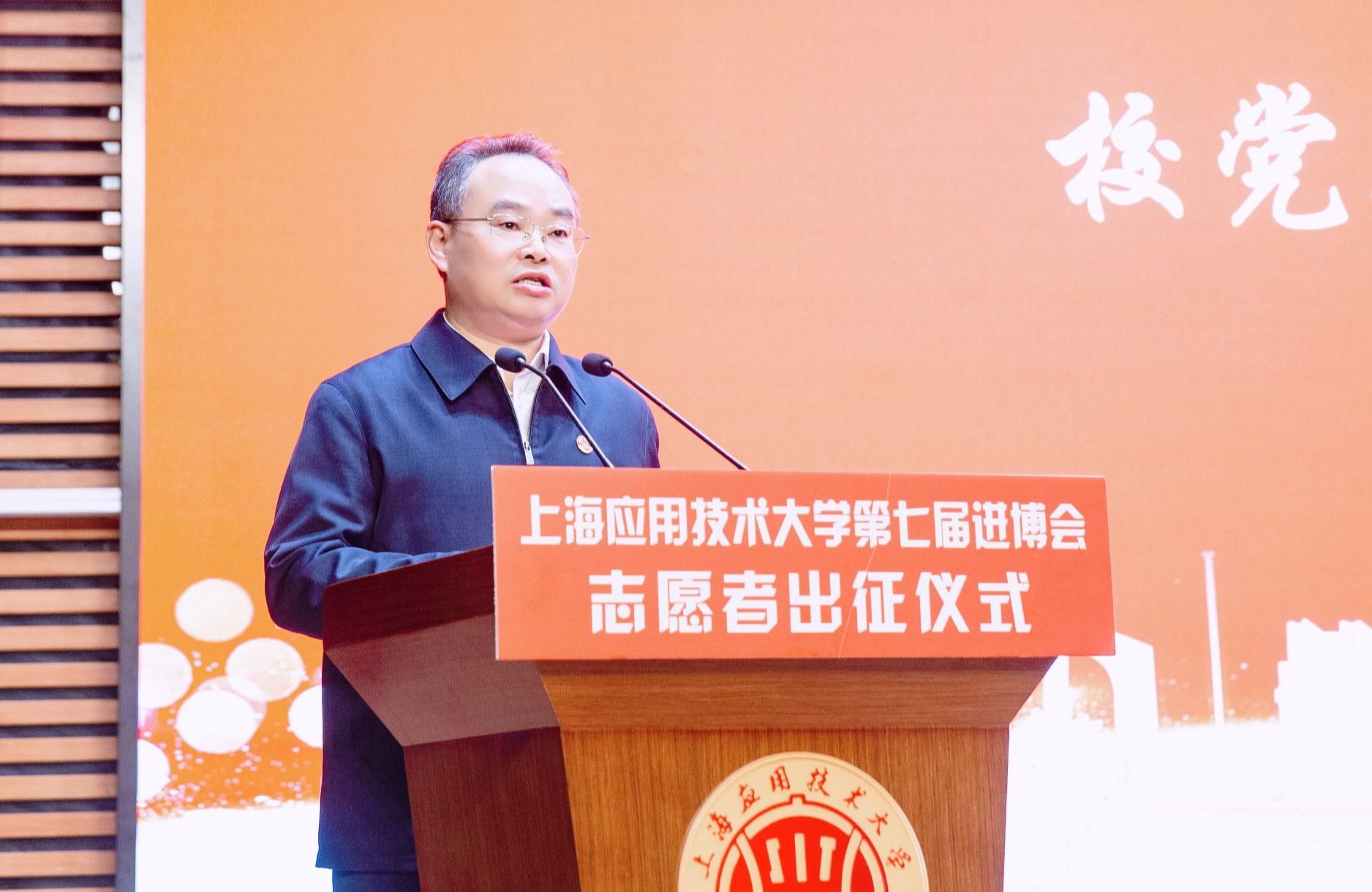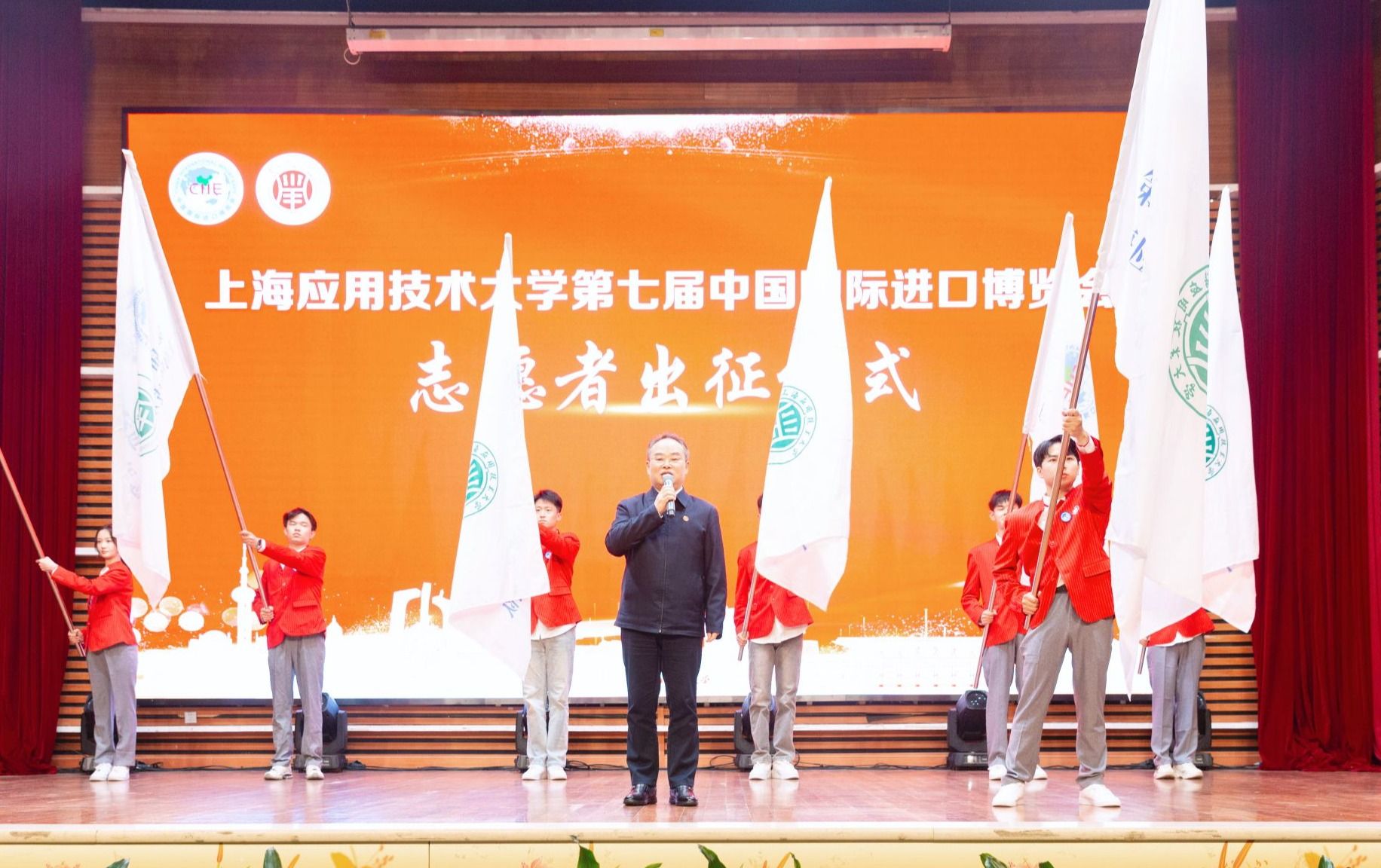郭庆松向上海应用技术大学第七届中国国际进口博览会志愿服务队授队旗并宣布出征。