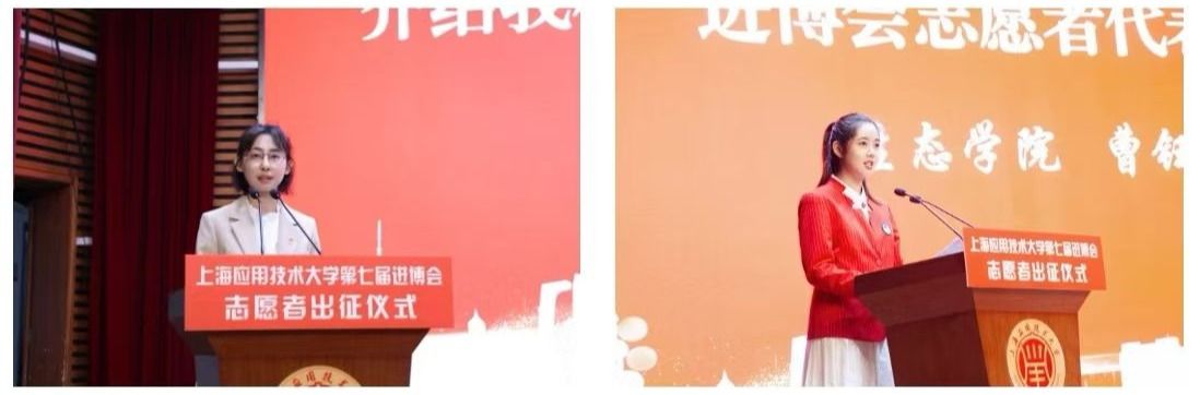 今天(10月25日)下午,上海应用技术大学第七届中国国际进口博览会志愿者出征仪式在奉贤校区学生活动中心多功能厅举行。校党委书记郭庆松为志愿者队授旗并作动员讲话,校党委副书记、副校长王瑛出席。校党委学工部部长、人民武装部部长、学生处处长袁翔主持仪式。