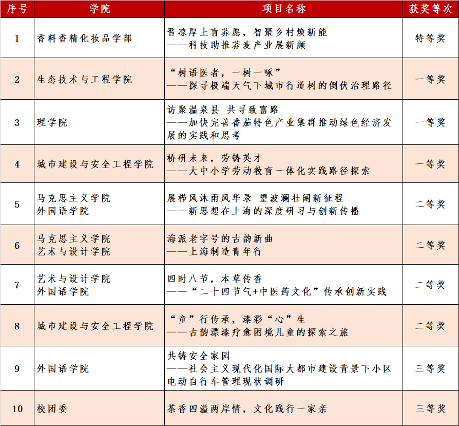 近日,由团市委、市委宣传部、市教卫工作党委、市教委、市精神文明办、市人大社会委、市政协社法委、市学联共同主办的2024年“知行杯”上海市大学生社会实践大赛决赛获奖结果揭晓,上海应用技术大学学子从全市近500个实践项目中脱颖而出,喜获特等奖1项、一等奖3项、二等奖4项和三等奖2项。