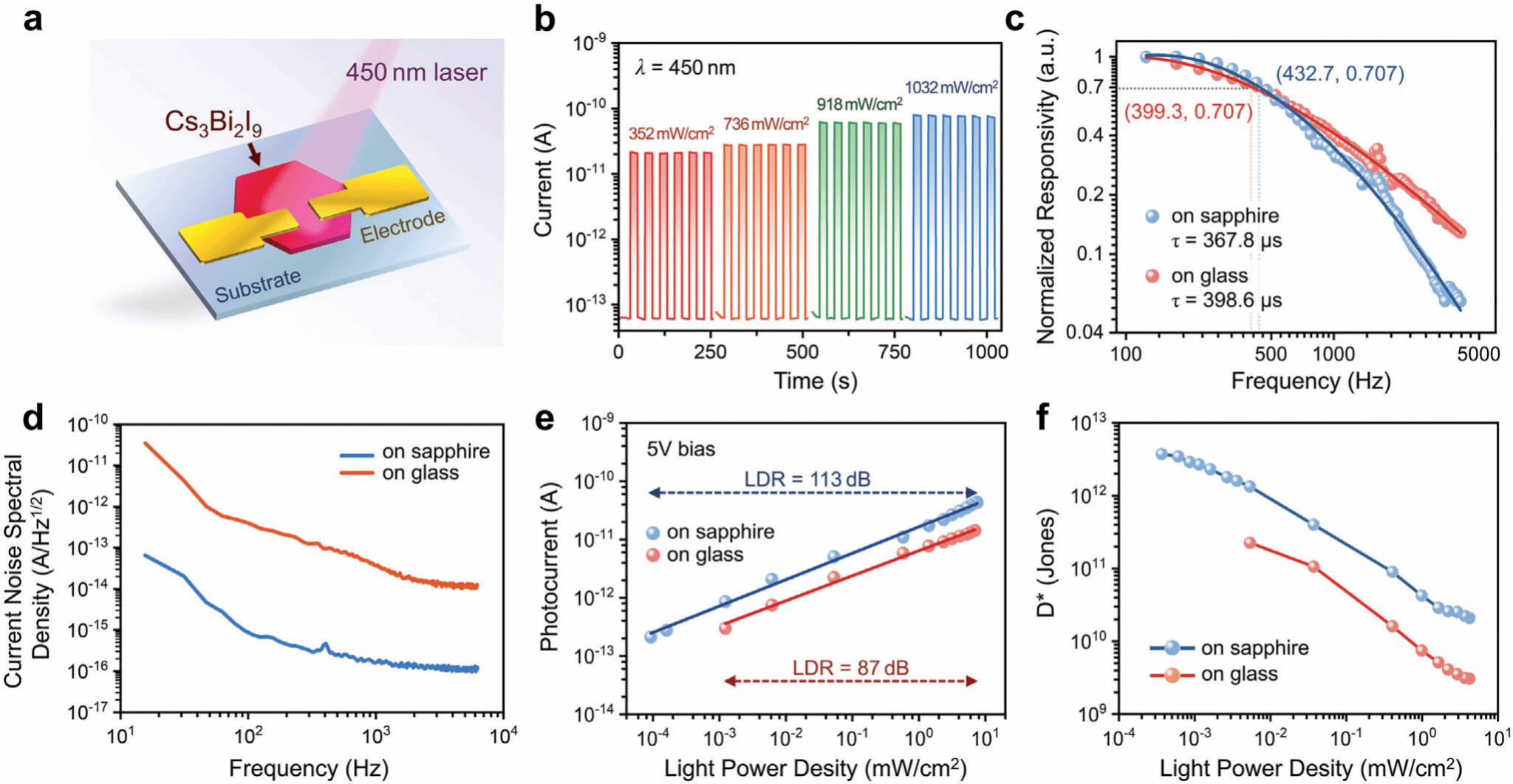 实验结果表明,基于在c面蓝宝石衬底上异质外延生长的异质外延单晶构建的光电探测器在450 nm波长的激光照射下,响应时间为367.8 μs,探测率达到3.7×10¹² Jones,线性动态范围(LDR)高达113 dB,远超传统玻璃衬底器件。此外,该光电探测器在多次开关循环和长时间测试中保持稳定,展现出优异的运行可靠性和长的器件寿命,为新型半导体材料异质外延生长及其器件应用提供了新的实验方法和理论支撑。