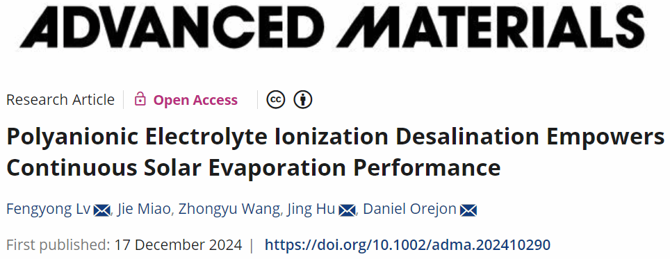 近日,城市建设与安全工程学院吕凤勇副教授课题组在《Advanced Materials》(IF=27.4是一本备受瞩目的材料科学领域国际顶级期刊)上在线发表题为“Polyanionic Electrolyte Ionization Desalination Empowers Continuous Solar Evaporation Performance”的研究成果,该研究论文是以上海应用技术大学为第一单位,该研究针对太阳能蒸发器在实际海水淡化过程中盐晶体析出问题,利用聚阴离子电解质功能化策略,实现优异的均匀脱盐性能,证明了聚阴离子电解质功能化作为排盐策略对高性能太阳能海水淡化技术和其他技术的发展具有卓越的益处。吕凤勇副教授为论文第一作者、研究生苗洁、王忠禹、胡静教授和爱丁堡大学Daniel Orejon老师作为本文通讯作者。