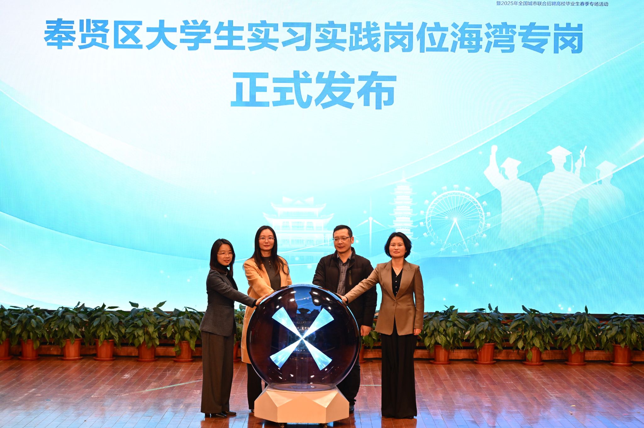 会上,“就·在海湾”大学生就业创业赋能驿站揭牌,奉贤区大学生实习实践岗位海湾专岗发布。