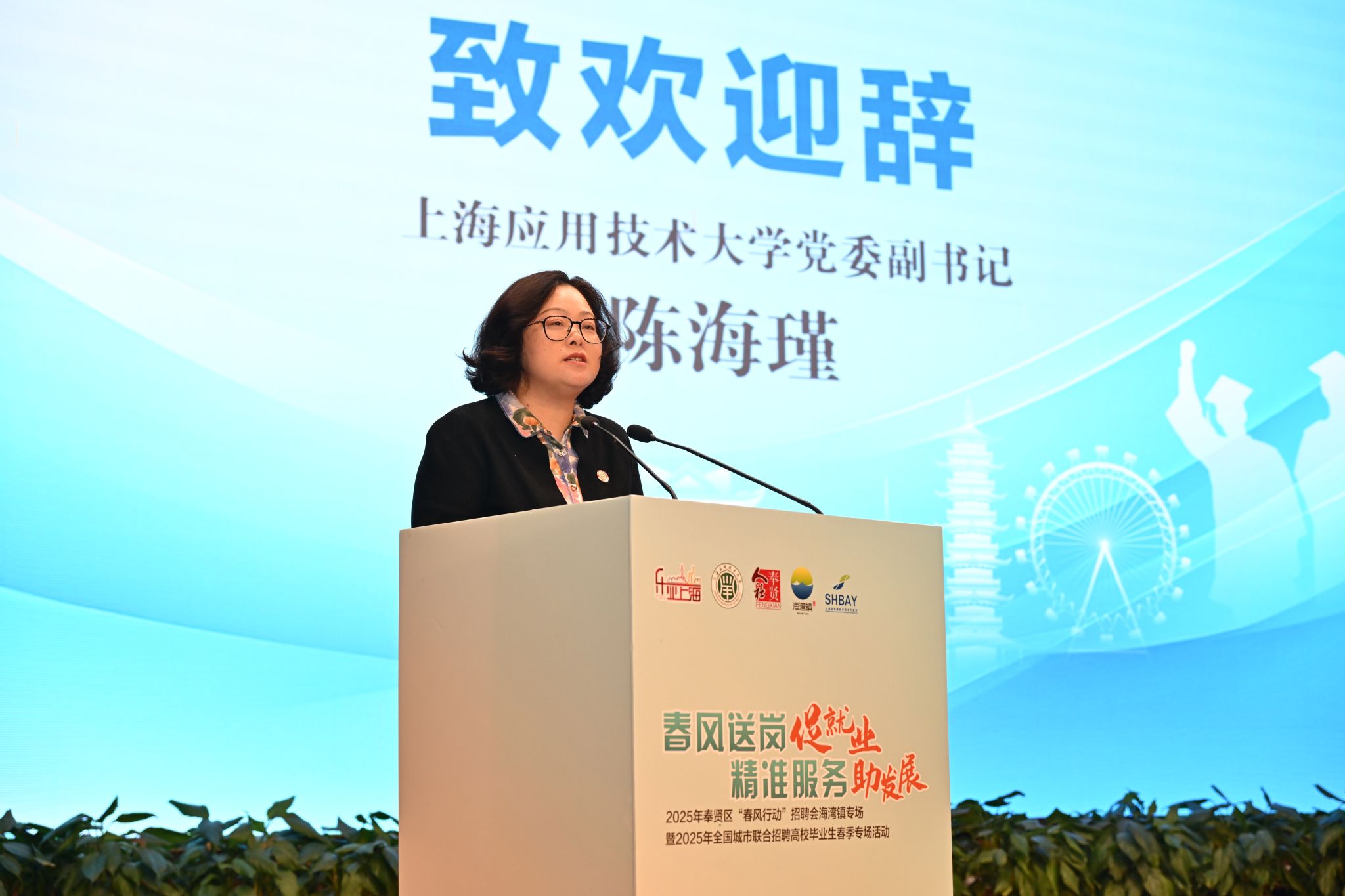 陈海瑾代表学校感谢奉贤区、海湾镇、临港奉贤园区及杭州湾工业开发区长期以来对学校就业工作的大力支持。她表示,学校与海湾镇多年来携手共进,在围绕地方发展需求,扩大合作深度广度上持续发力,开启人才互补、岗位互补、产业互补的合作新征程,希望今后继续携手共绘政校企协同发展的新图景,在协作中架起智慧的连心桥,于奋进里铺就创新的锦绣路,扎根海湾热土,共育发展之花。