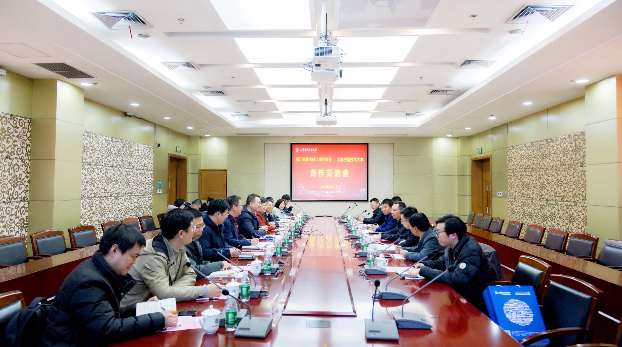 3月17日,浙江省政府驻沪办党组书记、主任李雄伟,金华市人民政府驻上海联络处主任郭亮等一行来访我校,就深化校地合作、共促高质量发展进行座谈交流。校长汪小帆、副校长王占勇热情接待。校学术委员会主任、香料香精化妆品省部共建协同创新中心主任柯勤飞,科学技术研究院、党政办公室、智能技术学部、香料香精化妆品学部、化学与环境工程学院等相关部门负责人参加座谈。