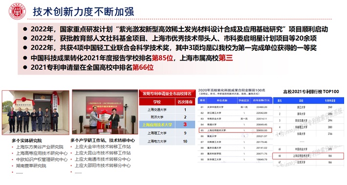 近年来,学校秉承“依产业而兴、托科技而强”的办学理念,搭建政产学研用“五位一体”的产学研深度融合新模式,与行业头部企业、各类学(协)会等加强对接,围绕企业科技需求开展研究,为企业解决了几千项技术难题。建立了信息化的知识产权管理体系,专利申请量和授权量连续多年位列上海市同类型高校第一名,有效地促进了学校的高价值专利培育及转化。