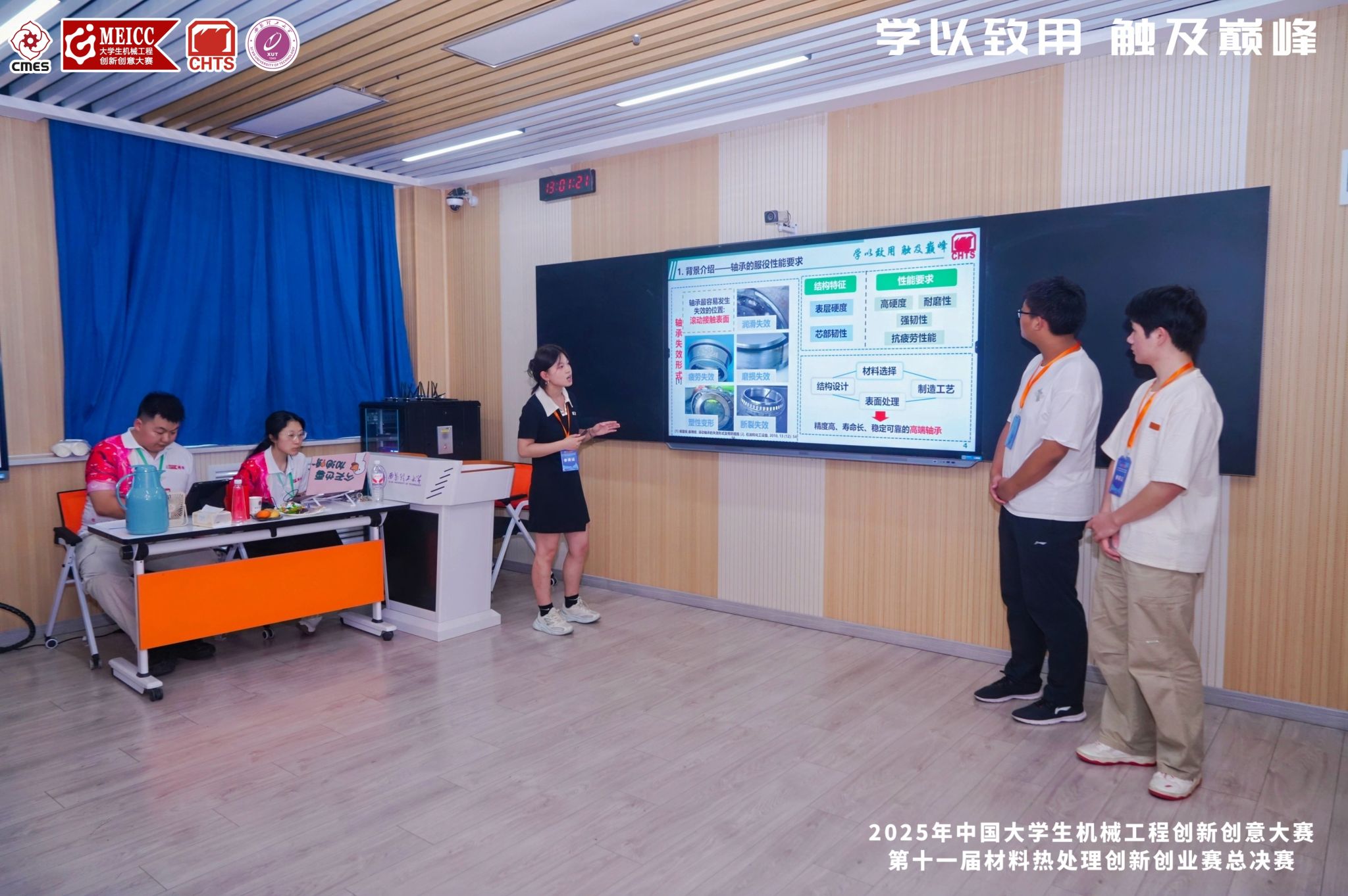 2023级本科生胡瑞、2024级李文勇等同学分别针对一种要求尺寸稳定的轴承零件和一种合金钢制工具进行充分的资料调研,通过PPT演示的形式向大赛评审专家汇报了合理选材的依据,并列出完整的零件或工具制造流程,明确提出热处理技术要求及相关热处理设备并制定了热处理工艺规范。
