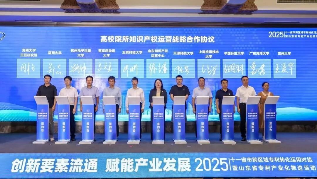 王占勇代表学校与山东知识产权运营中心签署了《高校院所知识产权运营战略合作协议》。根据协议,双方将在知识产权运营、产学研合作、专利盘点与收储、专利申请前评估等多个方面开展深度合作,共同推动专利技术转移转化和高价值专利产业化。