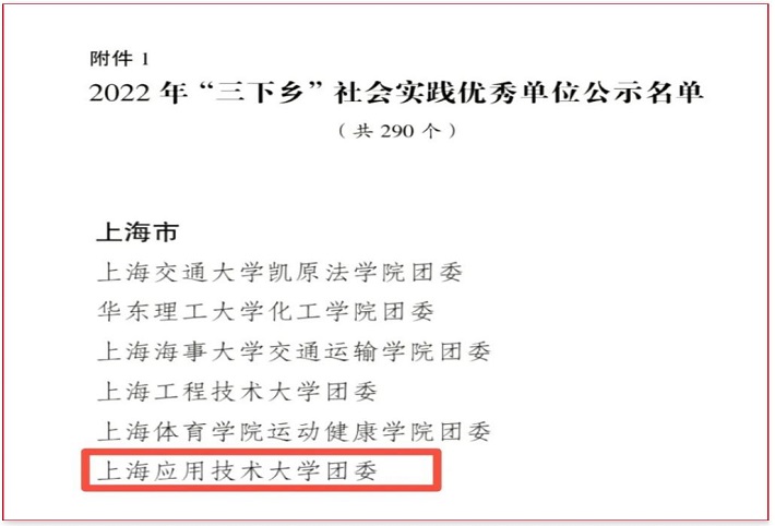 近日,共青团中央对在2022年全国大中专学生志愿者暑期文化科技卫生“三下乡”社会实践活动中表现突出的优秀集体、个人和项目予以表彰,上海应用技术大学团委荣获全国2022年“三下乡”社会实践优秀单位(上海共有6家单位获此荣誉)。