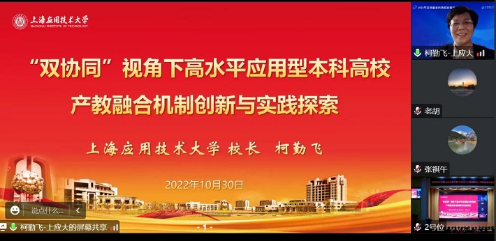 会上,柯勤飞以《“双协同”视角下高水平应用型本科高校产教融合机制创新与实践探索》为题,结合高等工程教育与高技术产业互动发展关系、应用型本科院校及创新型大学建设的内涵理念,深入阐述“双协同”产教融合机制创新理论内涵、地方应用型大学发展路径以及上海应用技术大学在高水平应用创新型大学发展中实现“双协同”产教融合机制创新的探索与实践成效。她指出,学校紧扣“应用创新理论与实践循环协同推进、应用创新理念与技术深度融合、应用创新体系与细节协调统一、应用创新制度与队伍共同提升”四方面,作为培养应用创新型人才的基本策略。她围绕学校建设“具有国际影响力的高水平应用创新型大学”的指导思想和目标定位,从“深化产教融合,提升应用创新型人才培养质量”“立足应用技术,提升学科建设和科技创新水平 ”“打造适应高水平应用创新型大学要求的师资队伍”“‘后疫情’时代积极开展合作共享的国际交流工作”等方面,全面交流了学校的发展举措与实践成效。