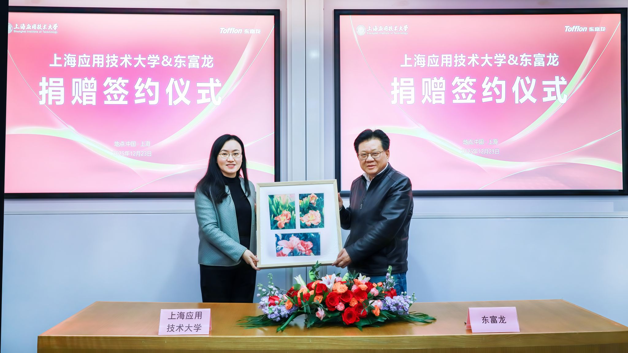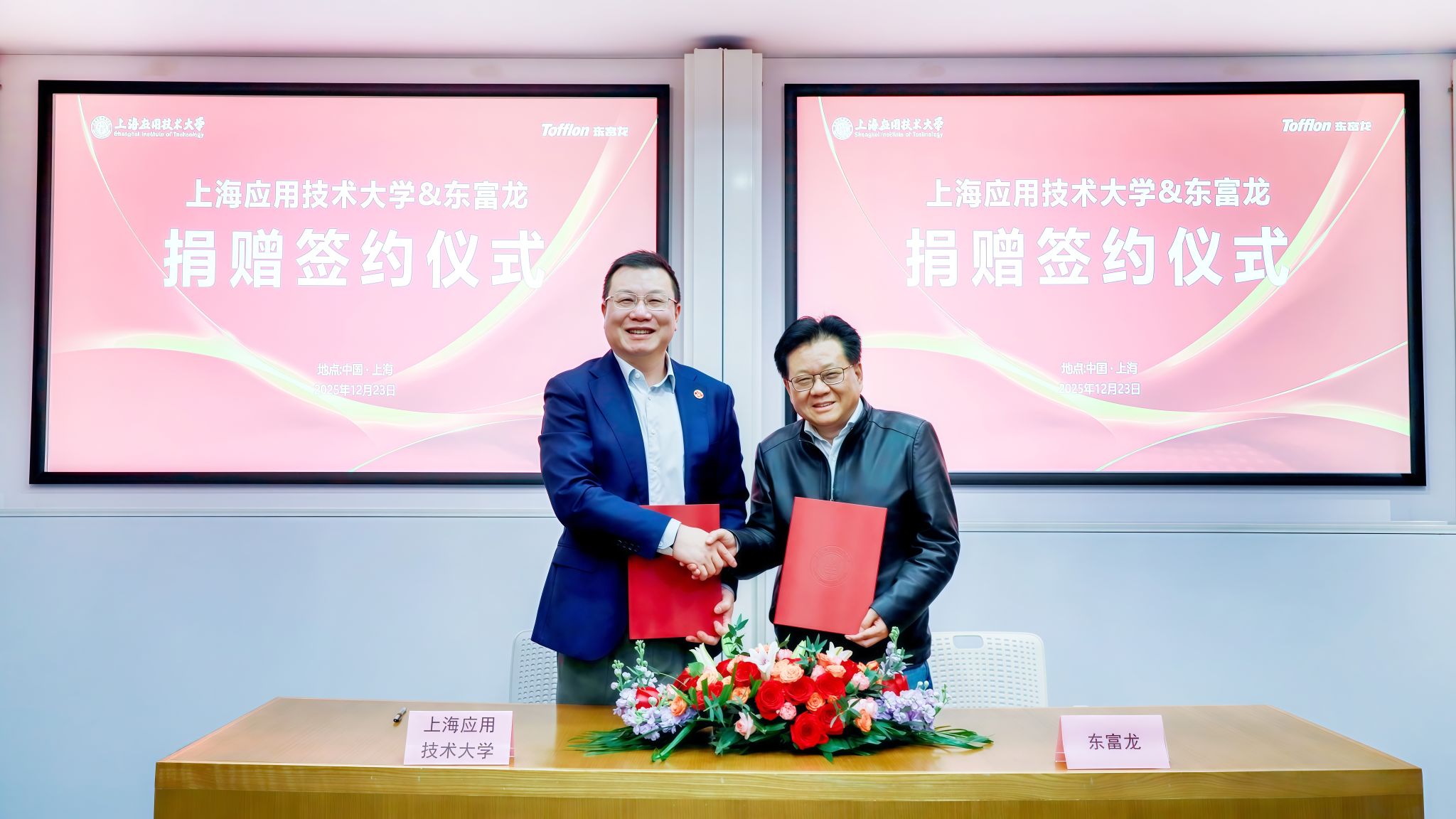 12月23日,上海应用技术大学与东富龙科技股份集团有限公司举行捐赠签约仪式,协商共建“智能制造创新研究院”。校长汪小帆,校党委副书记、副校长王瑛,东富龙科技股份集团有限公司董事长、我校1981级校友郑效东,高级副总裁、我校1992级校友郑金旺等校企代表出席仪式。