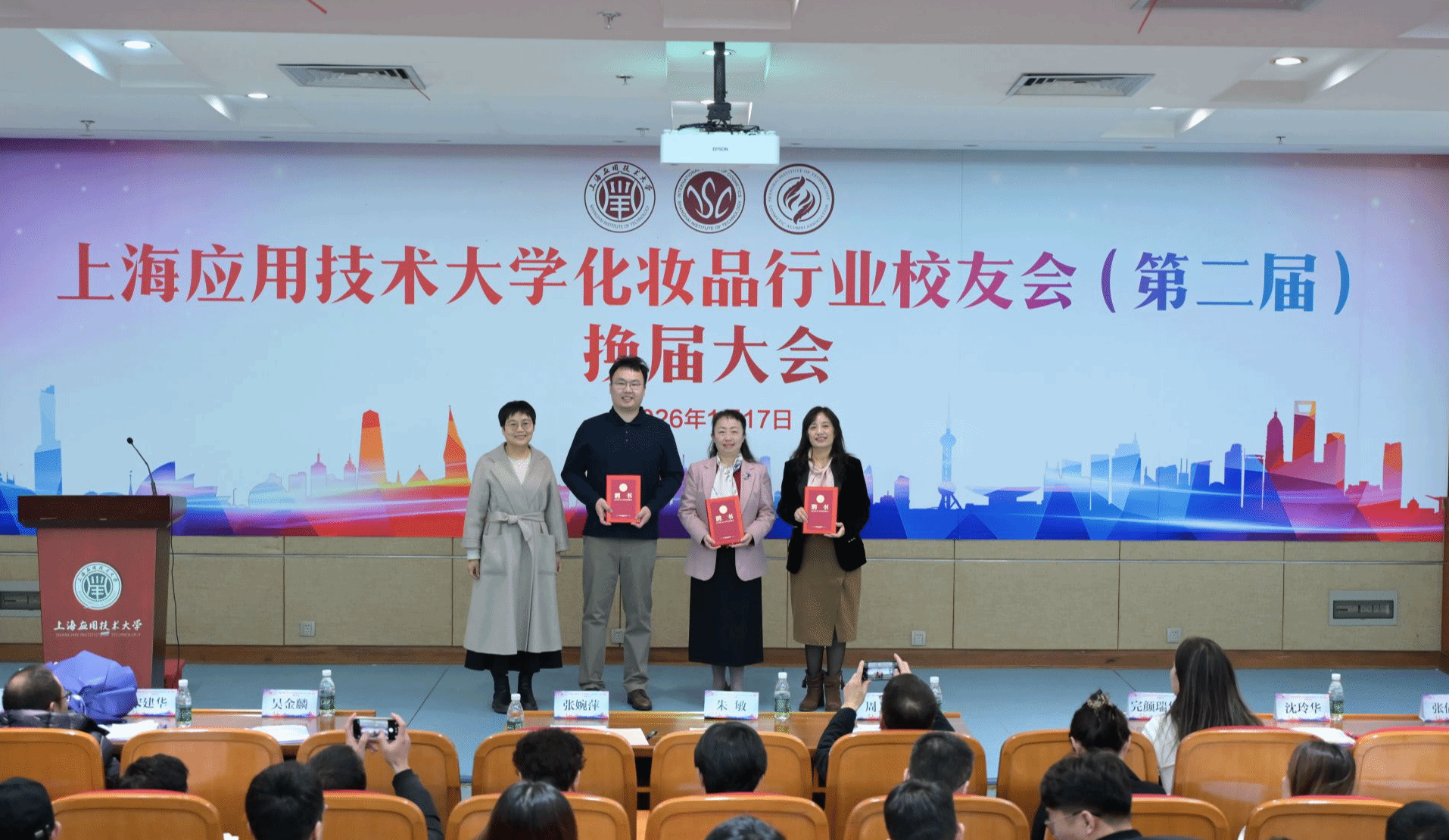 1月17日,学校化妆品行业校友会第二届理事会成立大会暨2026校友迎新年会举行。校友与发展联络处副处长(主持工作)、党政办副主任朱敏,香料香精化妆品学部党委副书记(主持工作)周义锋,国际化妆品学院、东方美谷研究院执行院长张婉萍,化妆品行业校友会第一届会长、瑞登梅尔(上海)纤维贸易有限公司个人护理品部门销售总监宋建华,第二届常务副会长、嘉法狮(上海)贸易有限公司个人护理商务总监沈玲华以及上海弘承化工有限公司总经理费一弘等出席活动。