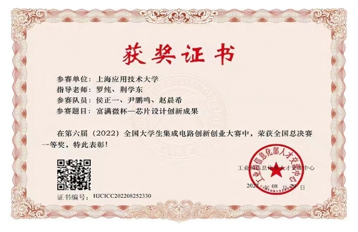近日,在国家工业和信息化部人才交流中心举办的第六届全国大学生集成电路创新创业大赛总决赛中,由我校罗纯教授和荆学东教授指导,化工学院学生侯正一、尹鹏鸣等的参赛项目《富满微杯—芯片设计创新成果》荣获全国一等奖。