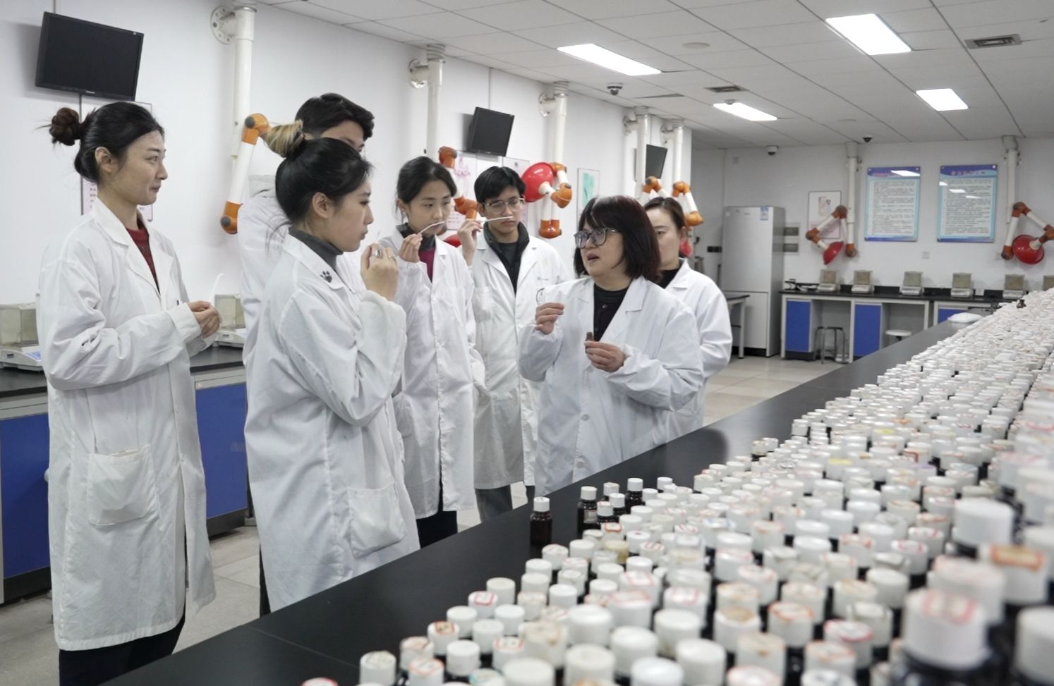 在实验室里,同学们正通过智能设备赋能调香全过程:依托自然语言处理技术,整合中国特色芳香植物化合物成分、香气愉悦度、健康功效靶点,搭建海量动态香气数据库,一键匹配香氛最优原料组合。