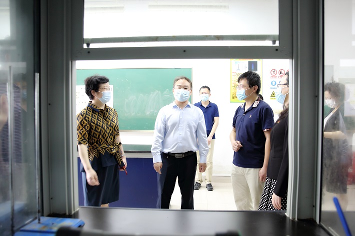 在第三学科楼,校领导查看实验室人员进出、消杀消毒、操作规范及试剂材料保管等工作情况,要求工作人员要按照实验要求规范穿戴和操作,同时按照疫情防控要求做好消杀和通风,确保教学科研有序推进和师生的健康安全。