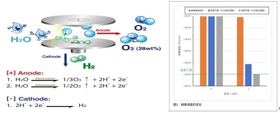 解密此项“黑科技”发生机理,其实通俗易懂,实为水分子在阳极端发生电解反应生成氧气、臭氧、氢离子和电子,具体为:一部分水分子经电解生成三分之一的臭氧,两个氢离子和两个电子,其中臭氧具体的质量占比为28wt%;还有一部分水分子经电解生成二分之一的氧气,两个氢离子和两个电子;在阴极端,两个氢离子又与电子合成为氢气。
