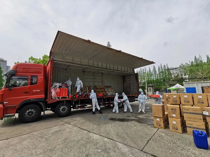 4月12日早晨,搭载着上千件爱心抗疫物资的鲁Q大货车,经过700多公里的长途跋涉,抵达奉贤校区。数以千计的饼干、奶酪、粥品等物资,是山东沂水县人民从千里之外星夜兼程送来的关怀与支持!