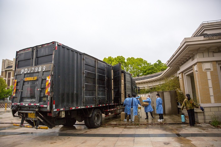 4月23日,上海姚记科技股份有限公司捐赠的40箱2000套白色防护服顺利运抵我校,助力学校疫情防控工作。