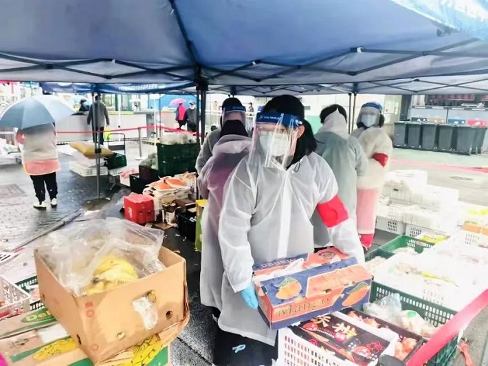 闵行区梅陇镇是此次疫情防控重点区域,继续教育学院杨颖丽老师主动请缨,加入所在社区疫情防控志愿队伍,她协助社区做好封控区内居民的生活保障工作,为封控隔离楼的居民分菜,按照整理出来的名单逐户上门派送。