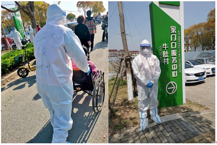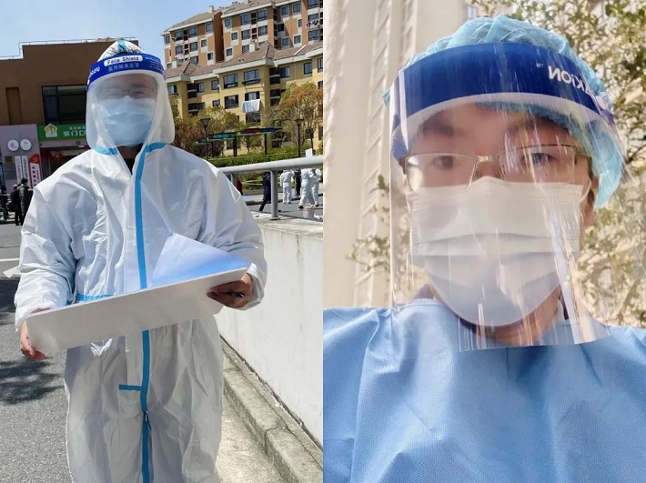 在得知村子里有一位瘫痪的老人无法到达核酸检测现场时,他徒步来回1公里,尽管防护服的鞋套磨破了、汗水灌满了整套衣服,他仍将老人接到现场,顺利完成了核酸检测。送回老人后,他又立马到达了新的岗位。疫情无情人有情,杨帅帅以自己的方式,做先锋,护上海!