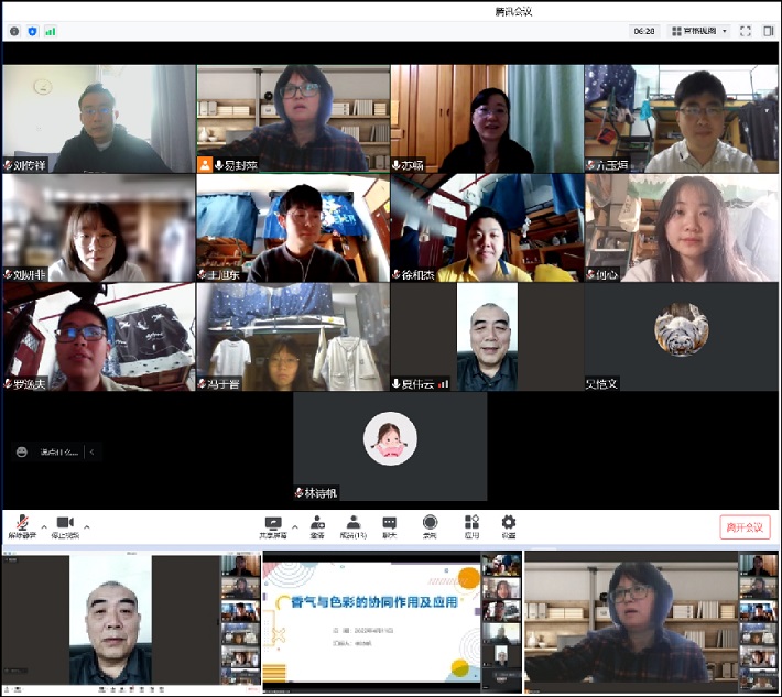 易封萍老师领衔的“天然精油在芳香疗法中的作用机制及应用”研究生跨学科校企导师团队。以项目推进的方式,通过召开线上组会,针对香气与色彩的技术开发和市场应用,达孚生物科技(上海)有限公司夏伟云高级工程师进行启发式指导,刘传祥副教授进行跨学科指导,易封萍教授结合课题研究工作和目前的市场开发前景进行分析指导,课题组老师和研究生积极交流,热烈讨论。
