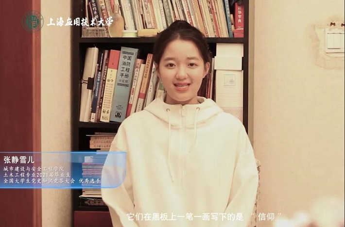 请党放心,强国有我!城建学院学生张静雪儿通过视频分享了她与复旦、交大、同济学子作为上海代表队,参加《全国大学生党史知识竞答大会》,勇夺“优秀选手”称号的故事,她说,青年学子要在为国奉献、为人民服务的时代大潮中搏击成才!