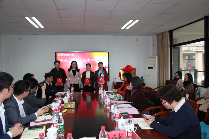 王瑛和吴飞飞共同为学校劳模(先进)创新工作室揭牌。校领导为劳模(先进)工作室主持人颁发聘书。