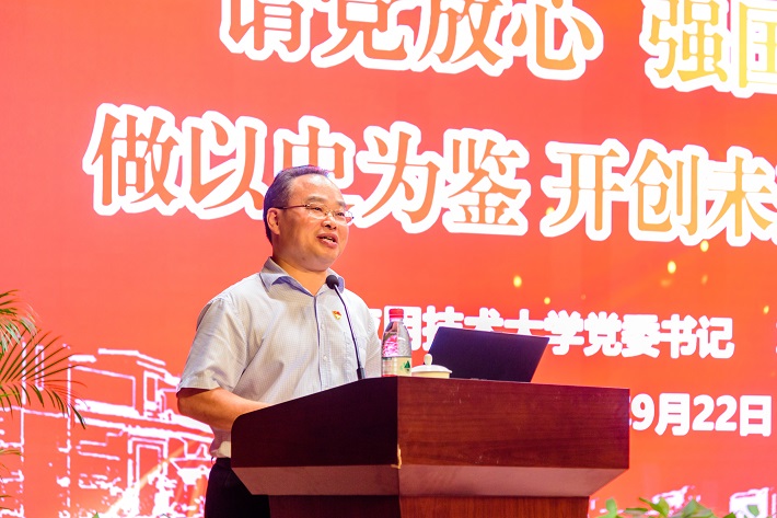 9月22日18:00,我校奉贤校区大学生活动中心礼堂座无虚席,校党委书记郭庆松以《请党放心,强国有我——做以史为鉴,开创未来的上应人》为题,为2021级新生讲授第一堂思政课。