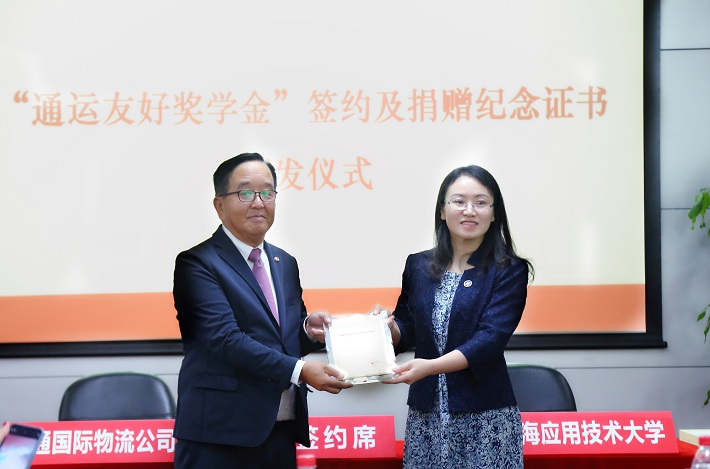 上海市人民对外友好协会副会长景莹,日本通运株式会社东亚地区总裁兼日通国际物流(中国)有限公司董事长杉山龙雄出席签约仪式。校党委书记郭庆松出席并致词,党委副书记、副校长王瑛主持签约仪式。