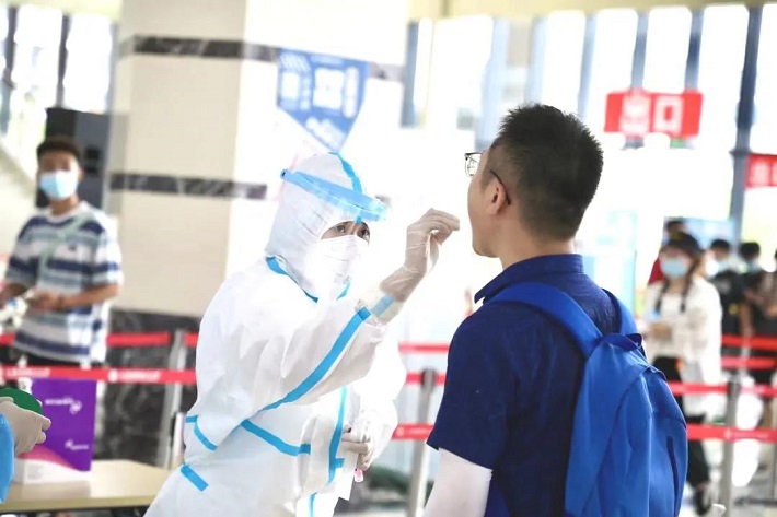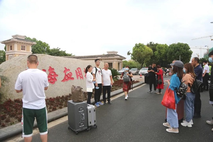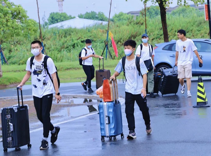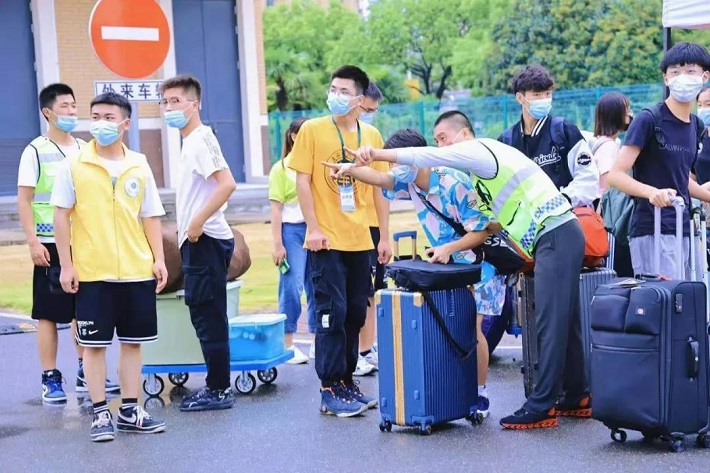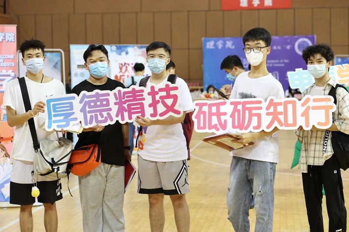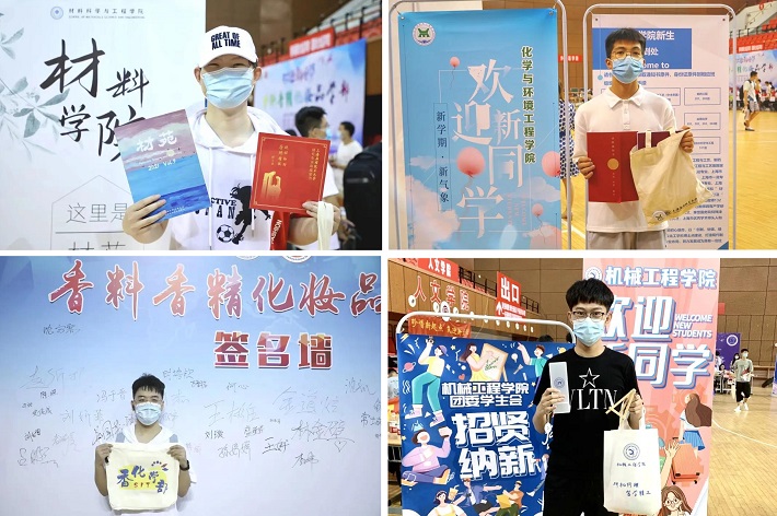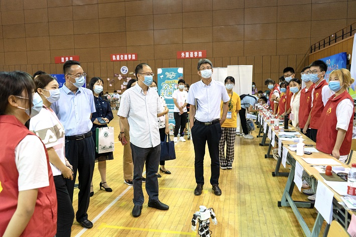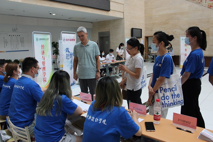 来到迎新现场,与前来报到的2021级新生亲切交流,