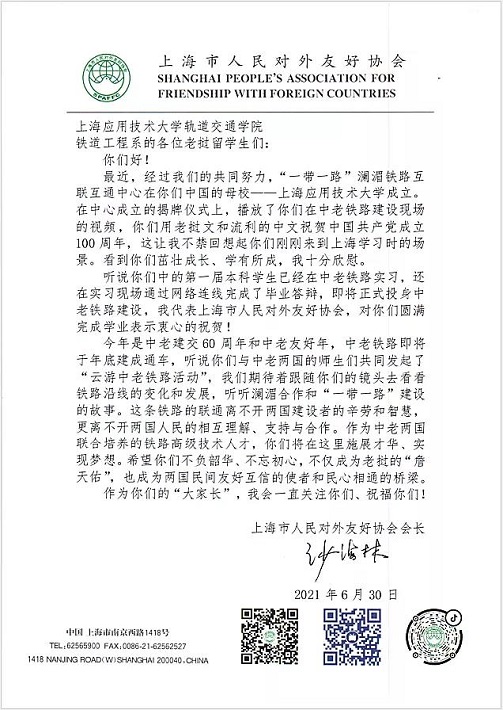 上海市人民对外友好协会会长沙海林一直以来高度关注和支持上海应用技术大学与老方高校携手培养中老铁路本土化铁路技术人才的工作,始终关心和关爱在校学习铁路工程专业的老挝留学生们。