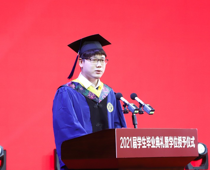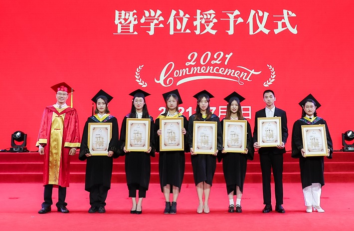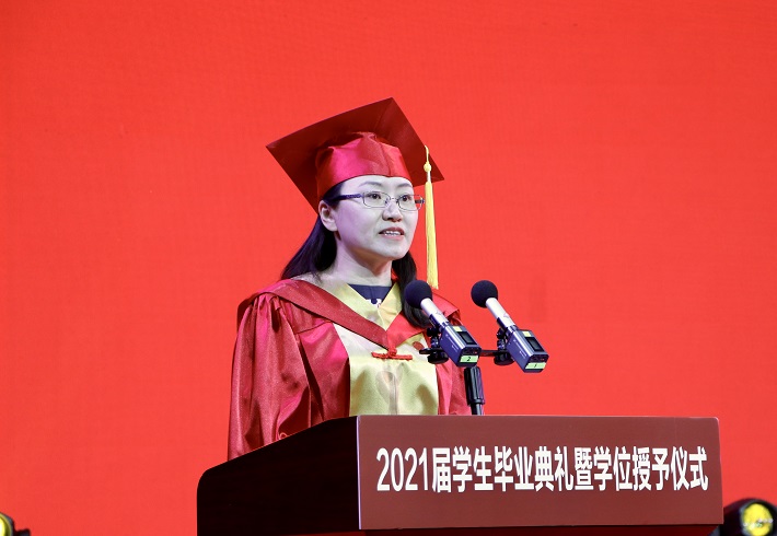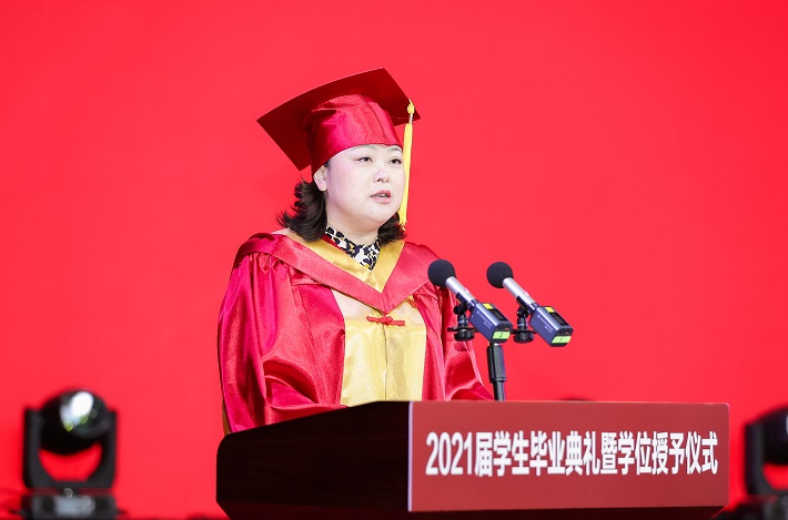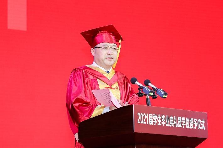 校领导郭庆松、柯勤飞、王瑛、陈海瑾、李健、张锁怀、毛祥东,校学位评定委员会委员、学院负责人、职能部处负责人、教师代表、校友代表和2021届全体毕业生欢聚一堂,共同见证和庆祝这一难忘时刻。校党委副书记、副校长王瑛主持毕业典礼。
