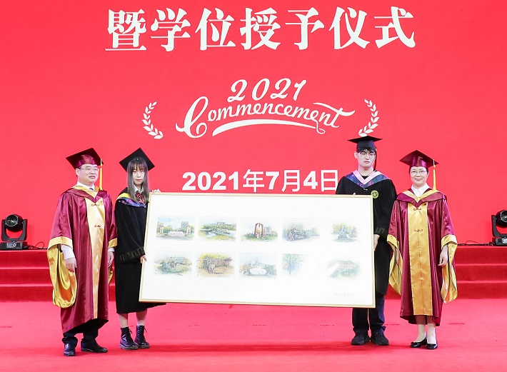2021届毕业生为感谢母校培育,精心为母校准备了一份毕业纪念礼物。这份由艺术与设计学院同学们绘制的校园十景图,把美好的校园风景定格在画卷中,将美好的校园时光珍藏在记忆里。辅导员老师与毕业生代表共同歌唱《上应•传奇》,送给所有即将为梦想而远行的上应学子,祝福毕业生们前程似锦、鹏程万里。