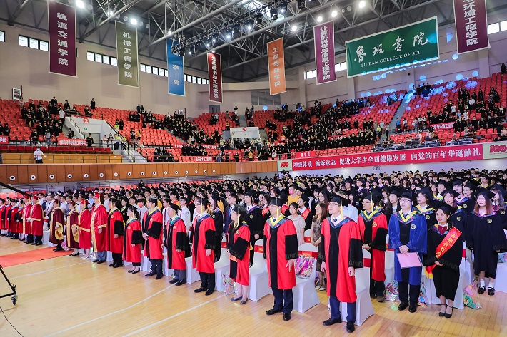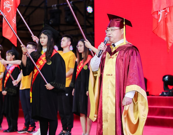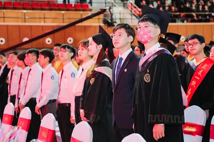 全体校领导及主礼教授上台为优秀毕业生授予学位证书并拨穗正冠。轻轻的拨穗声,是祝贺,也是期待;是告别,也是起航。