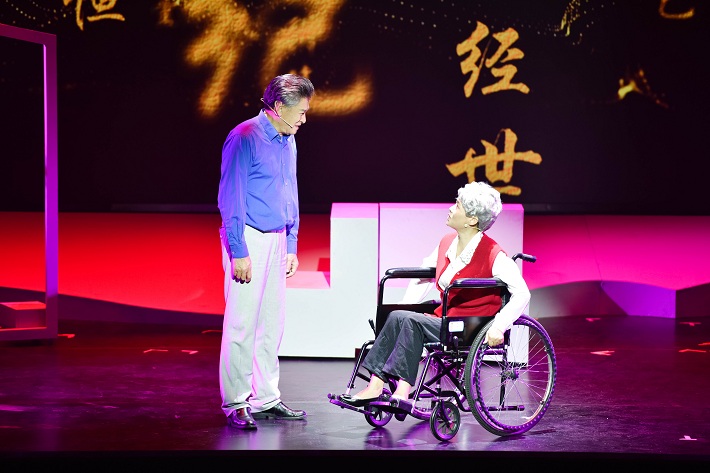 “忠诠,你慢点走,你好好看看这长长的碑廊。”“忠诠,我又以我们俩的名字向学校捐赠20万元,用于先贤语迹文化景观的建设。”眭忠诠手抚先贤语迹的警句箴言、祝尔纯手扶轮椅与丈夫真情隔空对话。第五幕把二老一生为党的思想情怀再度升华,他们因理想、因志向、因奋斗、因彼此倾爱而奉献不止的精神,弥漫在整个舞台,震撼着现场师生……