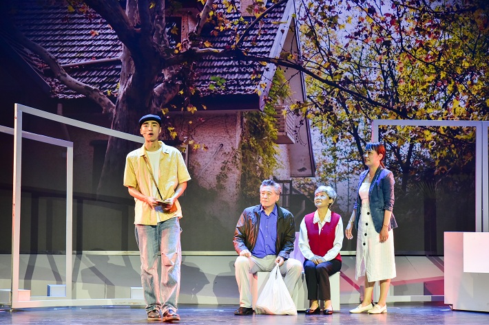 第三幕,“忠诠—尔纯”思想政治教育奖一等奖获奖教师许存辉面临抉择困惑,来向眭忠诠老人请教。眭老讲述了青年时代怀揣满腔救国图强之志,辞掉家父为自己谋就的优俸之职,毅然踏上革命道路的故事。父子间一番跨越时空的长谈,眭父悦纳了儿子的救国志向。父子之情、救国之志,激励眭忠诠毕生追求党的事业。眭老的故事,深深打动了许存辉,他决心把这种“为国为民”的精神传承下去,轻松走上继续关心帮助青年学生的事业道路。
