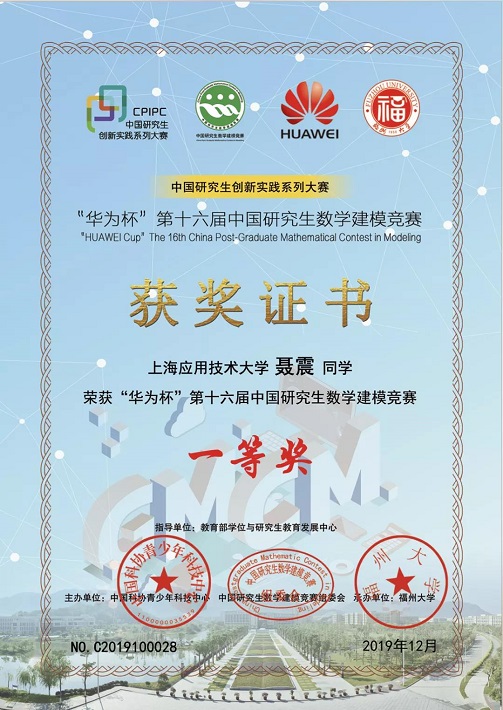 仿生装备与控制工程专业2018级研究生聂震获“华为杯”第十六届中国研究生数学建模竞赛一等奖