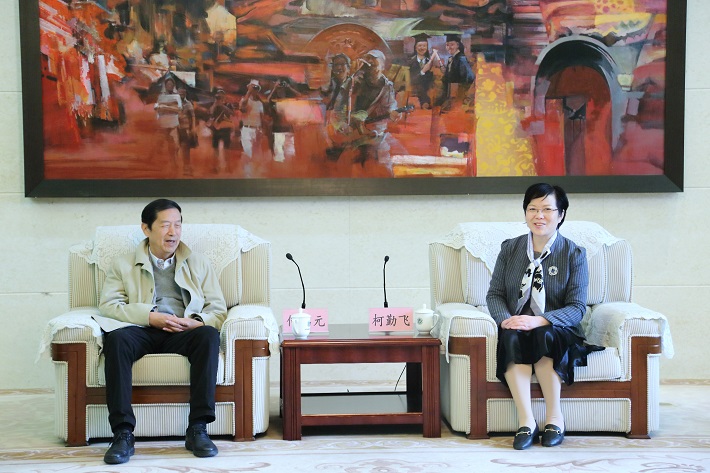 4月15日,学校举行迎校庆系列活动“大师风云”第二场讲座,中国科学院院士、华东师范大学终身教授何鸣元应邀来校主讲。校长柯勤飞在讲座前热情接待何鸣元院士,双方就进一步深化交流合作进行座谈。