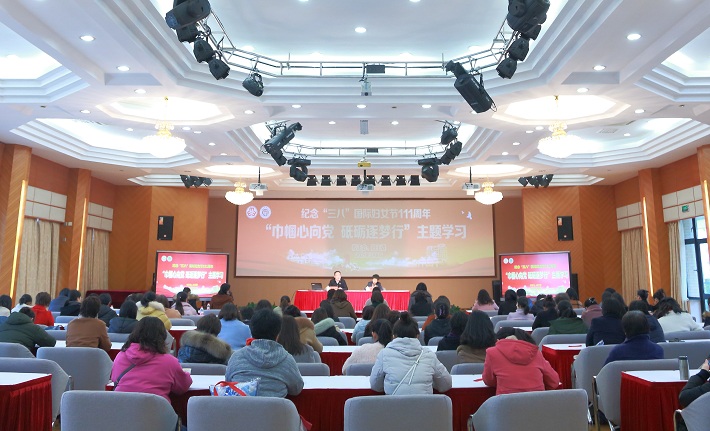 3月8日,学校举行“巾帼心向党 砥砺逐梦行”庆祝“三八”国际妇女节111周年系列活动,校党委书记郭庆松出席,向全校妇女同胞致以节日的问候和美好祝愿,并作题为“从党史学习教育中汲取智慧和力量”的专题报告。校党委副书记、工会主席宋敏娟主持报告会。学校女教授、女干部、女工委员及女教师代表参加活动并聆听报告。
