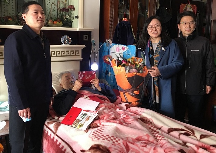 2021年2月25日,是我校抗战离休老干部张鹏飞的百岁生日。市委老干部局副局长范传伟、市教卫党委老干部处副处级调研员田永杰、校党委副书记王瑛在张老百岁生日前夕来到他家,代表市委老干部局、市教卫党委和校党委为张老祝寿,向他送上鲜花、贺卡、水果和慰问金。