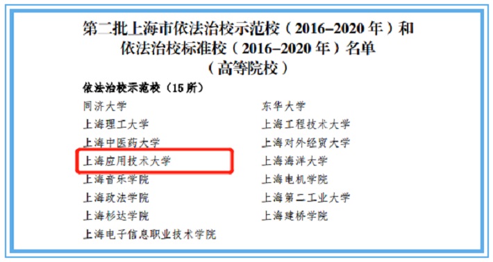 根据上海市教育委员会印发的《关于公布第二批上海市依法治校示范校(2016-2020年)和依法治校标准校(2016-2020年)名单通知》,学校被认定为第二批“上海市依法治校示范校”(2016-2020年)。学校将以此为契机,以《依法治校实施纲要》为指引,坚持依法治校、依规办学,推进大学治理体系和治理能力现代化,为建成具有国际影响力的高水平应用创新型大学提供坚实的制度保障,为推进高等教育治理体系和治理能力现代化,贡献上应力量。
